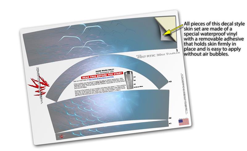 WraptorSkinz® skin wraps for 2017 RTIC Tumblers are printed using superb photo quality designs and vibrant colors printed with special fade resistant inks that last even in direct sun for years. WraptorSkinz® are a composite of two layers of commercial grade materials. The bottom layer is a soft, flexible vinyl with a special removable adhesive that is easily positioned, applied without air bubbles. Next we print the bottom layer with UV protected, fade resistant inks that deliver superb photo quality designs in vibrant colors. Finally we bond a professional grade laminate over the entire skin adding a glossy protective finish.